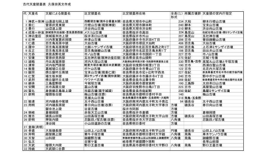 新日本書紀は日本書紀の解読を中心とする文献学だけではなく、考古学的成果も参照して立論しています。新日本書紀によると各天皇の陵は下表のような古墳に比定されます。拡大してモーダル表示されますので、画像をクリックして御覧下さい。比定の理由は新日本書紀を御覧下さい。